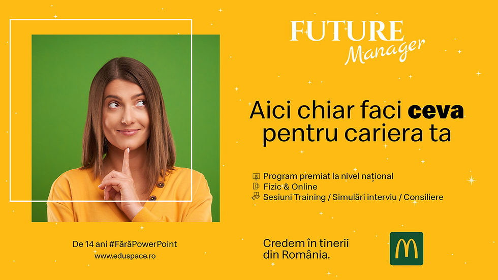 FUTURE Manager este programul de orientare în carieră creat pentru tineri care vor să își construiască o carieră reală, nu una teoretică. Aflat la a 3-a ediție, programul este dezvoltat de Eduspace în colaborare cu echipa McDonald’s în România și pune accent pe practică, experiență și învățare aplicată. Programul a fost premiat în cadrul Gala Employer Branding Award cu premiul 1 ca recunoaștere pentru implicarea în comunitate. Înscrierile în programul FUTURE Manager sunt gratuite și se realizează pe site-ul www.eduspace.ro/futuremanager.